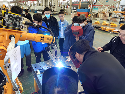 2021年4月26日,北京時(shí)代科技股份有限公司組織開設(shè)的2021年第一期手工+機(jī)器人焊接技能提升班在濟(jì)南時(shí)代焊接工業(yè)園開課了。全部課程為期5天,授課方式為技師現(xiàn)場(chǎng)授課、學(xué)員實(shí)操焊接練習(xí)。本次課程是時(shí)代公司精心籌劃的一個(gè)提升焊接專業(yè)學(xué)員機(jī)器人操作水平的培訓(xùn)課。授課老師均為時(shí)代公司高級(jí)焊接技師。培訓(xùn)設(shè)備為時(shí)代6公斤弧焊機(jī)器人、時(shí)代PNE61-400氬弧手工兩用焊機(jī),時(shí)代全數(shù)字TDN 5001MB氣保焊機(jī)、A160-350半自動(dòng)氣保焊機(jī)等。參加培訓(xùn)的學(xué)員全部為國(guó)內(nèi)職業(yè)院校系統(tǒng)內(nèi)的年輕學(xué)員和教師。本次培訓(xùn)內(nèi)容主要以實(shí)際操作為主,焊接理論為輔。實(shí)操內(nèi)容包括焊條電弧焊、熔化極氣體保護(hù)焊、鎢極氬弧焊和機(jī)器人熔化極混合氣體保護(hù)焊等。
