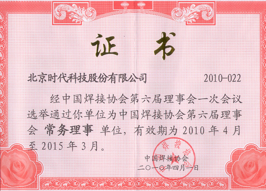 | 2010-04 | 中國焊接協會第六屆理事會常務理事單位 | 中國焊接協會 |