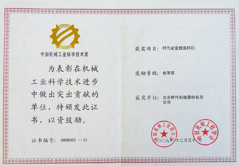 | 2009-12 | 中國機械工業科學技術獎 時代逆變埋弧焊機 | 中國機械工程學會 |
